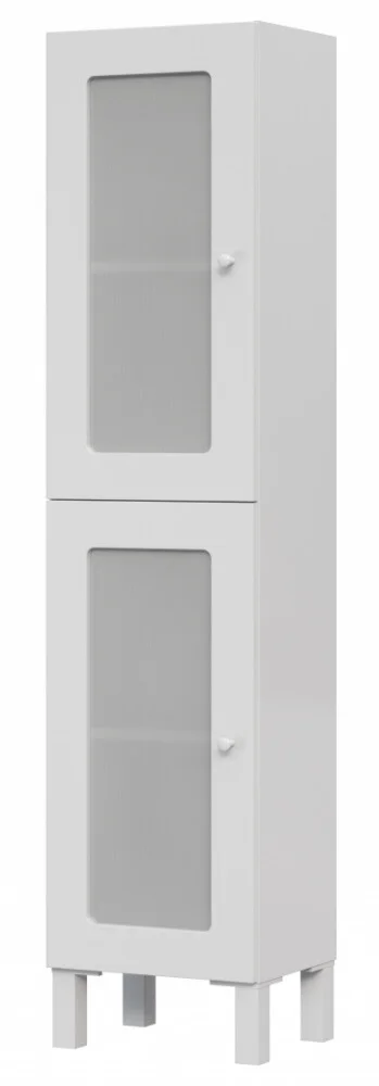 Конструкція пенала передбачає підлогове встановлення, що забезпечує стійкість без додаткового кріплення до стіни. Корпус виготовлений з ламінованої ДСП товщиною 16 мм, а фасади — з МДФ, обидві поверхні покриті високоглянцевою емаллю білого кольору для легкого догляду та стійкості до вологи. Декоративні вставки зі скла надають виробу сучасного вигляду, поєднуючи функціональність з естетикою.