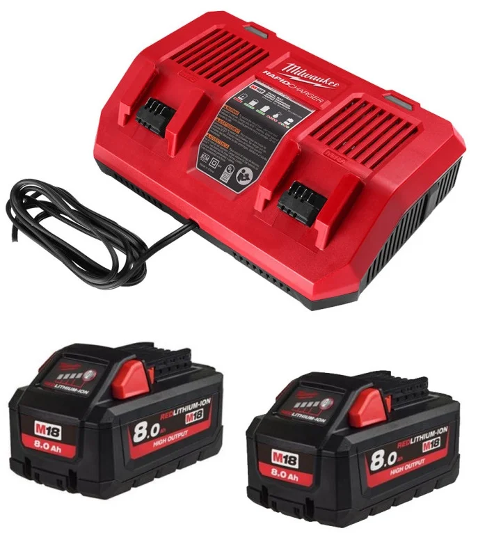 Комплект включає дві літій-іонні акумуляторні батареї Milwaukee High Output ємністю 8.0 Аг кожна, що працюють під напругою 18 В. Ці акумулятори забезпечують до 2,5 разів більший час роботи та до 20% більше потужності порівняно з іншими літій-іонними технологіями. Зарядний пристрій M18 DFC дозволяє одночасно заряджати обидві батареї, використовуючи технологію Milwaukee REDLINK для захисту від перевантаження та підтримки оптимальної роботи. Акумулятори мають міцний металевий каркас з амортизуючими елементами, що захищає їх від ударів та вібрацій, а також є вологостійкими та здатними працювати при температурах до -20°C.