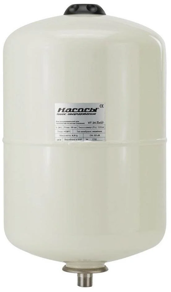 Розширювальний бак Насоси+ VT24 Solar призначений для компенсації збільшення об'єму теплоносія та стабілізації тиску в геліосистемах та системах опалення. Об'єм бака становить 24 літри, що дозволяє ефективно поглинати надлишковий тиск, запобігаючи пошкодженню системи. Максимальний робочий тиск бака досягає 1,0 МПа (10 бар).