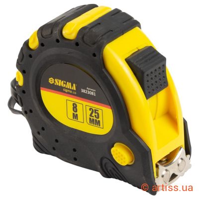 Рулетка обгумована з магнітним фіксатором та гальмом Sigma 8 м х 25 мм (3823081) — це надійний інструмент для професійного та побутового використання, який поєднує ергономіку, міцність і зручність у роботі.