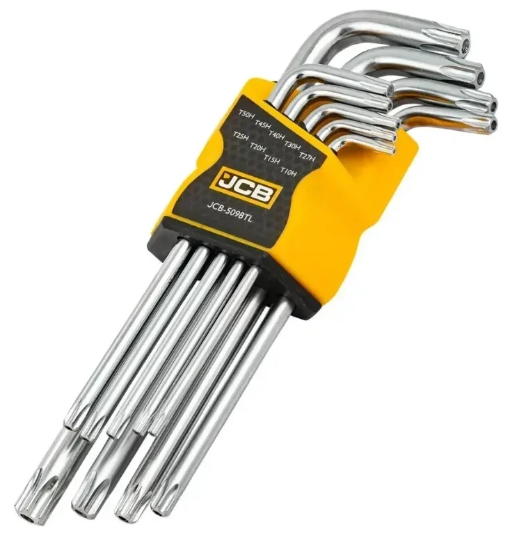 Набір Г-подібних TORX ключів з отвором JCB Tools T10H–T50H (9 од.) є професійним інструментом, призначеним для монтажу та демонтажу кріплень з внутрішнім шестилучевим профілем. Наявність отвору (H-профіль) дозволяє працювати з антивандальними гвинтами, що розширює сферу застосування інструмента.
