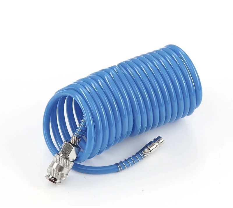 Поліуретановий матеріал надає шлангу відмінну стійкість до зношування, розтягування, механічних пошкоджень, а також до впливу хімічних речовин та ультрафіолетового випромінювання. Спіральна конструкція дозволяє шлангу автоматично повертатися до компактного розміру після використання, що забезпечує зручне зберігання та транспортування. Крім того, він зберігає свою гнучкість та функціональність у широкому діапазоні температур, що робить його придатним для використання в різних кліматичних умовах.