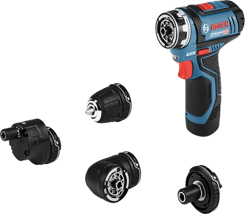 Інтерфейс Bosch FlexiClick включає вбудований магнітний тримач біт та дозволяє швидко встановлювати різні насадки: свердлильний патрон, кутовий свердлильний патрон та ексцентрик. Ексцентрик можна регулювати та фіксувати у 16 різних положеннях, що значно розширює можливості застосування інструменту. Система «One-Click» гарантує надійне та швидке кріплення насадок.