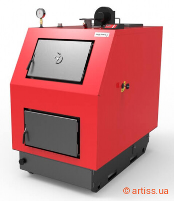 Модель твердотопливного котла имеет трехкамерную структуру. Первая камера - топка - имеет большой объем и позволяет загрузить большой объем топлива. Вторая камера исполняет роль отбора тепла от продуктов сгорания и имеет большую площадь поверхности теплообмена. Третья камера - зольник - предназначена для накопления пепла и остатков продуктов сгорания. Для интенсификации процесса горения предусмотрена установка вентиляторов.