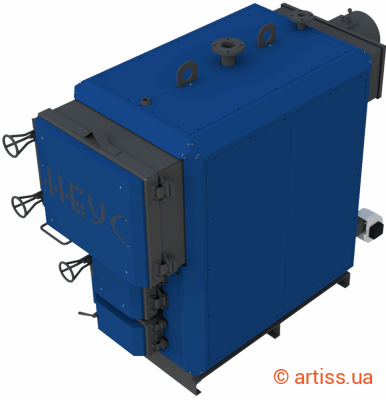 Теплообменник изготовлен в виде цилиндра, в котором размещены ряды стальных труб. Это обеспечивает максимально эффективный теплообмен и экономное сжигание топлива. Для производства теплообменника используется высококачественная сталь толщиной 6-8 мм. Конструкцией котла предусмотрена чугунная колосниковая решетка, которая обеспечивает равномерное сжигание топлива, независимо от его уровня влажности. Поддержание заданной температуры в котле обеспечивается блоком управления с PID, который плавно изменяет частоту вращения вентилятора. Такая система обеспечивает устранение газов, выделяющихся в процессе горения, а также защиту отопительной системы от закипания теплоносителя. Загрузка топлива осуществляется в ручном режиме. Для перевода котел в режим автоподачи топлива, необходимо установить пеллетную горелку.