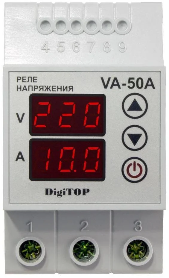 Пристрій для захисту електрообладнання та побутової техніки від недопустимих перепадів напруги, а також від перевантажень по струму. Реле DigiTOP VA-50A постійно аналізує параметри мережі та автоматично відключає підключені прилади, якщо напруга виходить за встановлені межі. Відновлення подачі живлення відбувається автоматично після повернення напруги до нормованого діапазону.