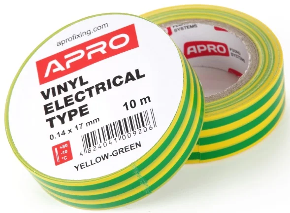Ізоляційна стрічка 0.14х17мм 10м жовто-зелена (кратно пачці - 10 шт) Apro (ET-10YG)