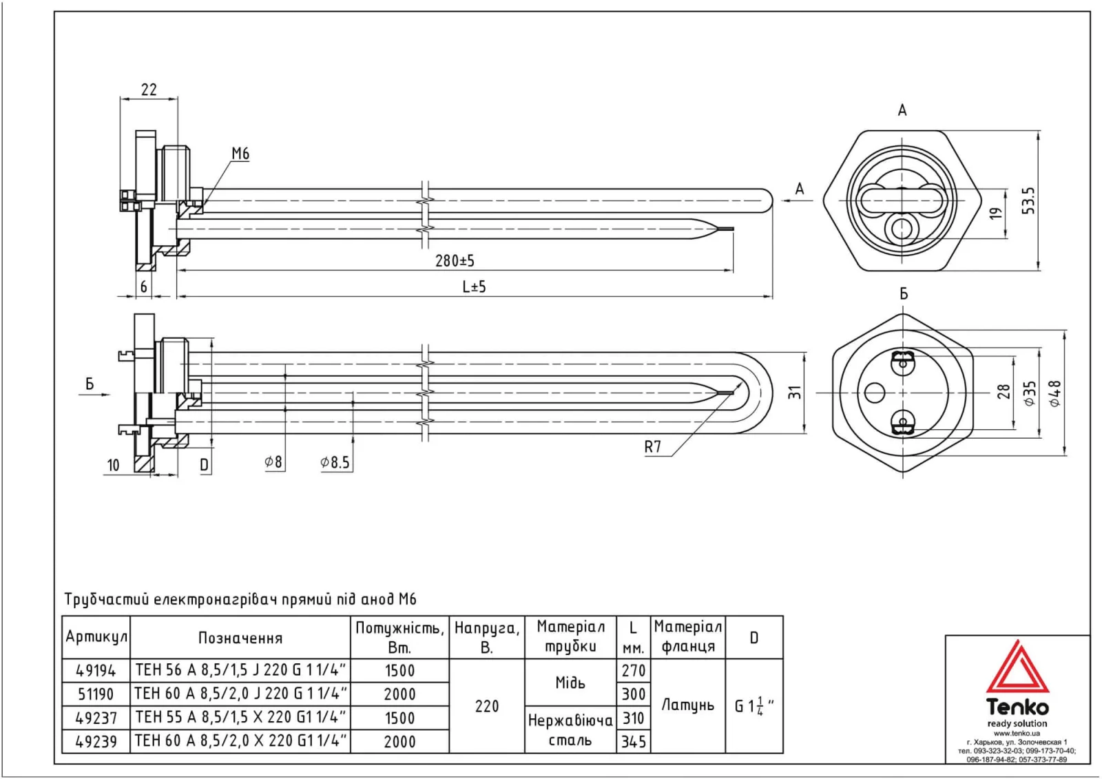 Інформація про продукт "Електричний ТЕН TENKO 1,5 гайка, прямий (нерж.), під анод"
