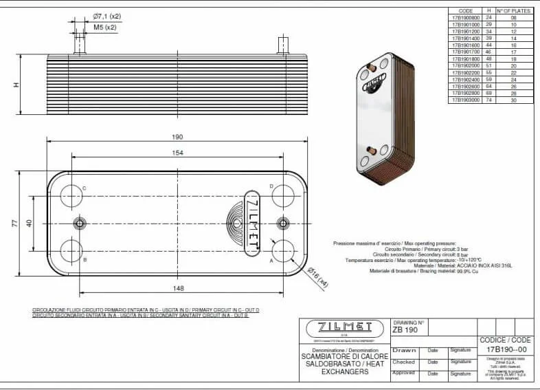 Конструкція вторинного теплообмінника складається з 14 пластин із нержавіючої сталі марки AISI 316 L, які забезпечують стійкість до корозії та високої температури. Корпус виготовлений з чистої міді (99,9%), що сприяє ефективному теплообміну. Пристрій розрахований на роботу в системах гарячого водопостачання газових котлів при максимальному тиску до 8 бар та температурному діапазоні від -10 °C до +120 °C.