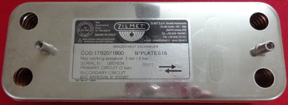 Вторинний пластинчастий теплообмінник призначений для передачі тепла від опалювального контуру до контуру гарячого водопостачання в газових котлах. Конструкція з 16 пластин із нержавіючої сталі забезпечує ефективний теплообмін та стійкість до корозії, що сприяє довговічності роботи вузла. Виріб виготовлений у Італії брендом Zilmet, що гарантує відповідність оригінальним технічним стандартам.