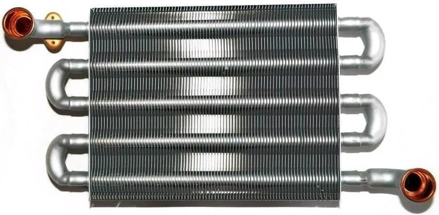 Первинний теплообмінник призначений для передачі тепла від газового пальника до теплоносія у системі опалення. Виготовлений з міді, він забезпечує високу ефективність тепловіддачі та стійкість до корозії. Конструкція зварена за допомогою високотемпературного паяння, що гарантує міцність і герметичність швів під тиском.