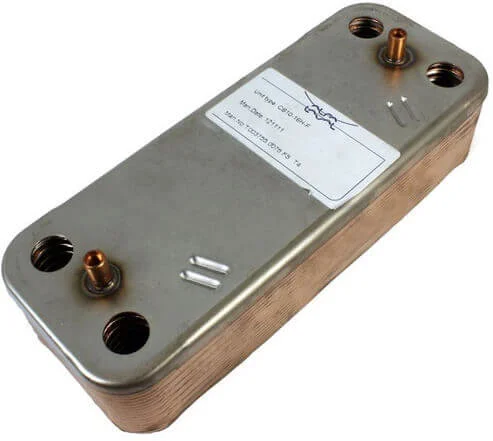 Вторинний теплообмінник виконаний зі сталевих пластин, що забезпечує ефективний теплообмін між контурами опалення та гарячого водопостачання. Для підвищення тепловіддачі та захисту від корозії пластини покриті спеціальним захисним шаром.