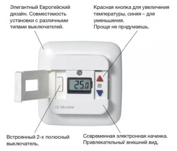 Пристрій оснащений двома датчиками: вбудованим датчиком температури повітря та виносним датчиком температури підлоги, який також виконує функцію обмежувача. Це дозволяє точно регулювати обігрів, запобігаючи як надмірному нагріванню, так і відчуттю холодної поверхні. Терморегулятор працює від мережі 220 В та здатен керувати навантаженням до 3500 Вт (16 А), що робить його сумісним з більшістю систем електричної теплої підлоги. Точність налаштування температури становить 0,5 °C, забезпечуючи стабільність заданого режиму. Монтаж терморегулятора здійснюється прихованим способом у стандартну монтажну коробку, а його ультратонка конструкція (глибина вбудовування лише 18 мм) залишає достатньо місця для підключення кабелів. Корпус має ступінь захисту IP21, що дозволяє встановлювати його у приміщеннях з підвищеною вологістю, таких як ванні кімнати.