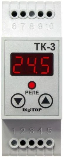 Електронний терморегулятор DigiTOP ТК-3 призначений для точного контролю та підтримання заданого температурного режиму в житлових і виробничих приміщеннях. Він забезпечує автоматичне ввімкнення та вимкнення нагрівального або охолоджувального обладнання, працюючи за одним каналом з відображенням поточної температури на цифровому світлодіодному індикаторі.