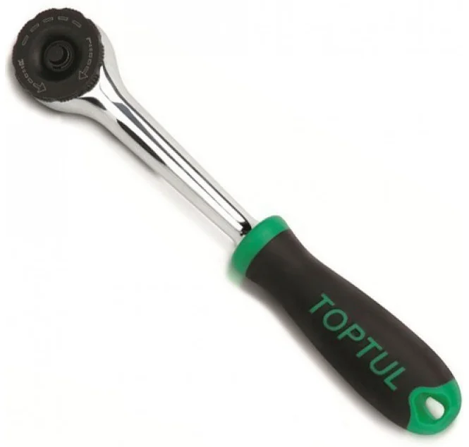 Фрикційна тріскачка Toptul використовує обгінну муфту замість зубчастого механізму, що забезпечує плавну роботу без характерних клацань. Корпус з хромомолібденової сталі (CR-MO) поєднується з ергономічними рукоятями з комбінованого матеріалу (PP+TPR), стійкого до мастил та підвищених навантажень.