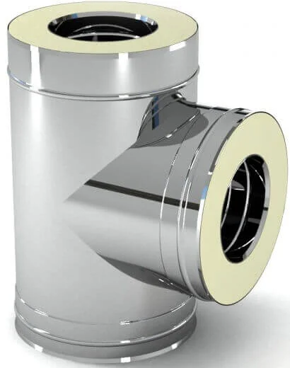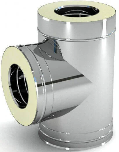 Внутрішня стінка трійника виготовлена з нержавіючої сталі товщиною 1 мм, що гарантує високу стійкість до агресивних середовищ, які утворюються під час згоряння палива, та значно подовжує термін служби виробу. Кут 87° дозволяє зручно з'єднувати вертикальні та горизонтальні ділянки димоходу, а також ефективно відводити конденсат, що утворюється в системі. Між стінками розташований шар теплоізоляції, зазвичай з базальтового волокна або вермикуліту товщиною 3-3,5 см, який витримує високі температури та має низьку теплопровідність.