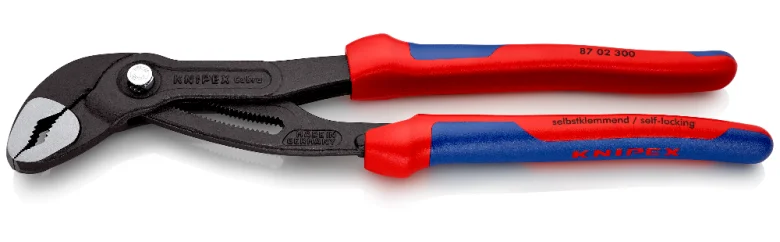 Розвідні сантехнічні кліщі Knipex Cobra довжиною 300 мм призначені для надійного захоплення та обертання труб, гайок та інших деталей діаметром до 70 мм (2 3/4 дюйми). Виготовлені з хромованадієвої сталі, кованої та багаторазово загартованої в маслі, ці кліщі відрізняються високою міцністю та довговічністю. Захватні губки мають спеціально загартовані зубці з твердістю приблизно 61 HRC, що забезпечує надійне зчеплення з поверхнею деталі.