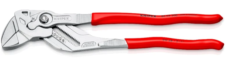 Переставні кліщі та гайковий ключ Knipex 2 1/2" (модель 86 03 300) є універсальним інструментом, що поєднує функції кількох ключів та кліщів, замінюючи цілі набори метричних та британських гайкових ключів. Інструмент виготовлений з хромованої сталі та має довжину 300 мм, забезпечуючи надійність та довговічність. Діапазон захвату становить від 0 до 68 мм, що дозволяє працювати з широким спектром кріпильних елементів.