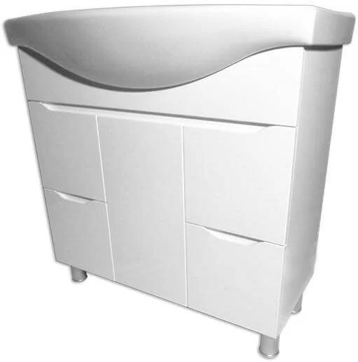 Конструкція моделі передбачає підлогове встановлення та розрахована під монтаж умивальника шириною 95 см. Каркас виготовлений з ДСП, а фасад — з МДФ у білому кольорі, що забезпечує стійкість до вологи у ванній кімнаті. Модель постачається в комплекті з умивальником і регульованими ніжками для зручного монтажу на нерівній підлозі.