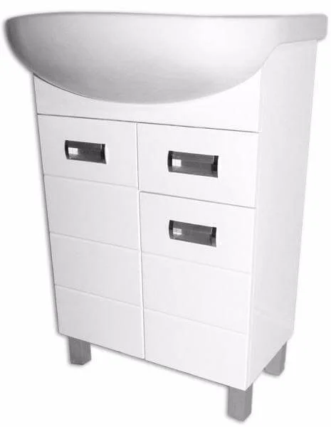 Підлогова конструкція з двома відділеннями за філенчастими дверцятами та одним висувним ящиком забезпечує зручне зберігання необхідних у ванній речей. Фасади виконані з МДФ, а корпус — з ламінованого ДСП, що забезпечує стійкість до вологи. В комплектацію входить тумба, накладний умивальник Солос 56 та регульовані ніжки для стабільного встановлення на будь-якій поверхні.