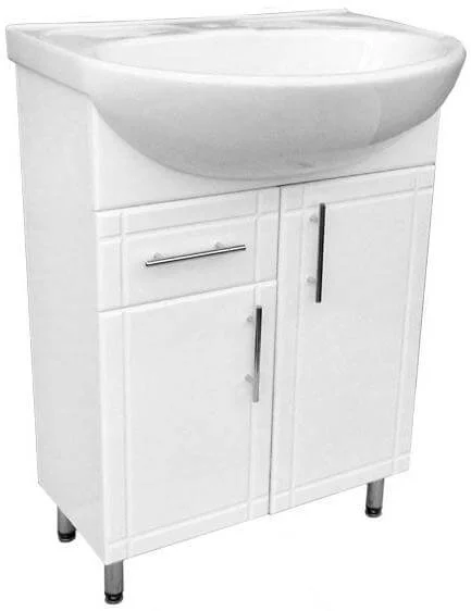 Підлогова конструкція забезпечує стійкість і зручне розміщення у ванній кімнаті. Тумба комплектується умивальником, що дозволяє створити готовий санвузол без окремого підбору мийної чаші. Каркас виготовлений з ДСП, а фасад з МДФ, що забезпечує достатню міцність та стійкість до вологи у типовому для ванної середовищі.