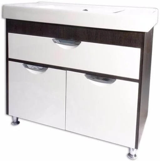 Конструкція поєднує підлогову тумбу з двома великими висувними ящиками та керамічним умивальником, що утворює готовий комплект для облаштування ванної кімнати. Корпус та фасад виготовлені з ламінованого ДСП та МДФ товщиною 16 мм у комбінації кольорів білий та венге, що забезпечує стійкість до вологи та перепадів температури. Ширина 1000 мм забезпечує достатню робочу поверхню та місткість для зберігання.