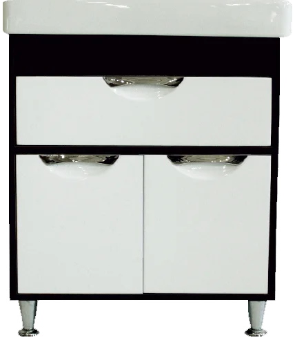 Підлогова конструкція забезпечує стійкість та зручне розміщення в просторі ванної кімнати. Модель комплектується умивальником, що входить у вартість, та регульованими ніжками для вирівнювання на нерівній підлозі. Каркас виконаний з ДСП, а фасад з МДФ, що забезпечує достатню міцність при експлуатації в умовах підвищеної вологості.