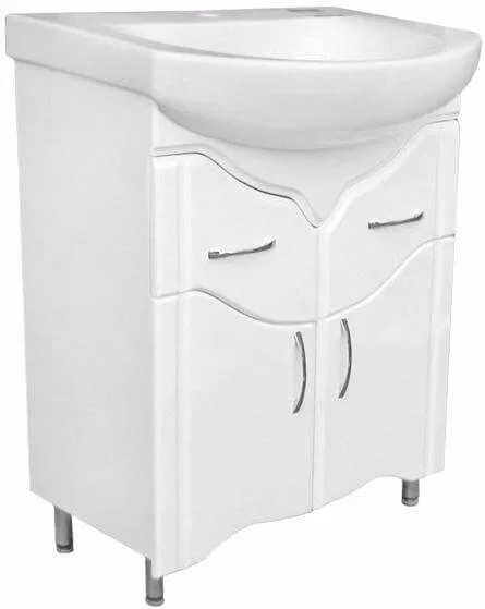 - Повна комплектація: до складу меблевого гарнітуру входить сама тумба, керамічний умивальник Лотос 70 з отвором під змішувач та системою переливу, а також регульовані ніжки для стабільного встановлення на підлозі.