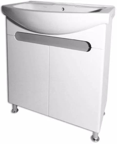 Підлогова конструкція з двома розпашними дверцятами забезпечує зручний доступ до внутрішнього простору для зберігання. Корпус виготовлений з ДСП, а фасад — з МДФ, пофарбований білою емаллю з високим ступенем блиску, що сприяє легкому догляду та стійкості до вологи. У комплектацію входить умивальник Ізео 75, який технічно та візуально інтегрований з дизайном тумби.