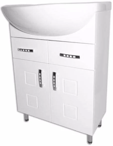 Підлогова конструкція з ДСП та фасадом з МДФ забезпечує стійкість у вологому середовищі ванної кімнати. Модель комплектується умивальником Акцент 65, а також має два видвижні ящики та велике нижнє відділення для зберігання побутової хімії та аксесуарів.