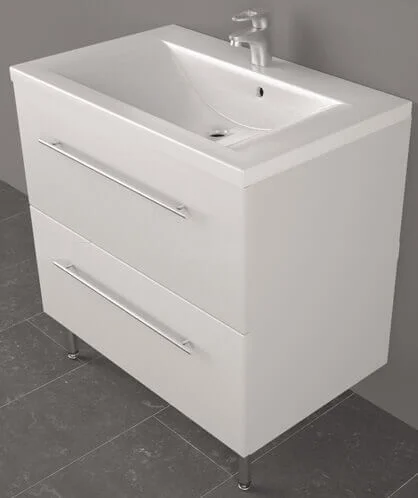 Підвісна тумба для ванної кімнати з цільним умивальником виготовлена з ламінованих вологостійких плит МДФ, що захищає конструкцію від вологи. Фасад покритий міцним меламіновим покриттям білого кольору, а всі торці закриті ПВХ-кромкою для довговічності. У комплектацію входить умивальник із литого мармуру (доломіту) з інтегрованим переливом.
