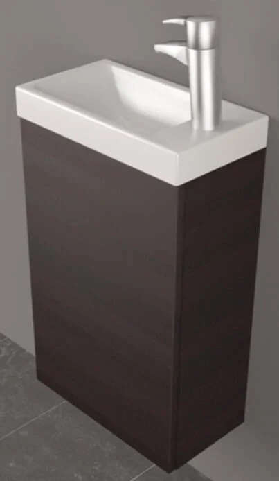Підвісна тумба для ванної кімнати з інтегрованим умивальником відрізняється компактними розмірами та функціональністю. Корпус виготовлений з ламінованого вологостійкого ДСП з ПВХ-кромкою, що забезпечує стійкість до вологи. Фасад з МДФ покритий білою глянцевою емаллю, що створює контраст із темним кольором венге.