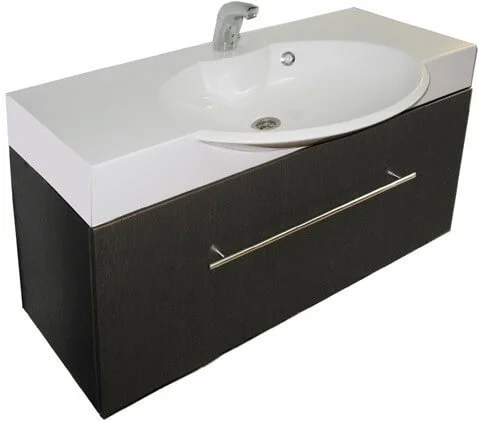 Підвісна тумба з умивальником має розміри 40,7х97,8х40 см та виконана у сучасному дизайні з фасадом кольору венге. Корпус виготовлений з ламінованого МДФ з меламіновим покриттям та ПВХ-кромкою на торцях, що забезпечує стійкість до підвищеної вологості. Умивальник із штучного мармуру (доломіту) має гладку непористу поверхню, стійку до забруднень та ударів, та оснащений переливом.