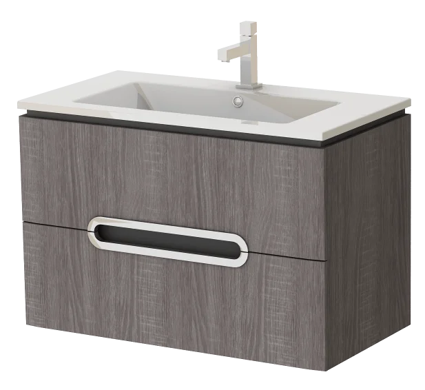 Комплект поєднує підвісну тумбу з керамічним умивальником, що забезпечує готове рішення для облаштування ванної кімнати. Корпус тумби виконаний з МДФ товщиною 16 мм сірого кольору, а фасадні частини — з МДФ товщиною 19 мм, обидва покриті матовою структурною ПВХ-плівкою кольору «eiche dorato truffel».