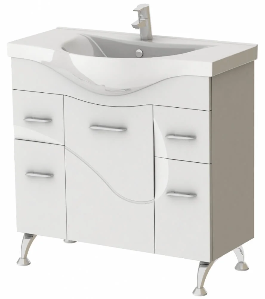 Тумба з умивальником призначена для підлогового встановлення та підходить для створення основного мийного вузла в ванній кімнаті. Білий глянцевий варіант візуально розширює простір.