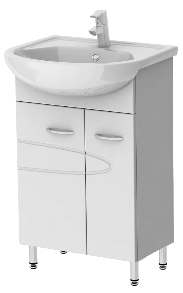 Конструкція включає підлогову тумбу з двома фасадами та керамічний умивальник, що входить до комплектації. Корпус виготовлений з ламінованого ДСП товщиною 16 мм, фасадні частини — з односторонньо ламінованого МДФ тієї ж товщини, всі поверхні покриті високоглянцевою білою емаллю. Тумба встановлюється на регульовані хромовані ніжки, що дозволяє вирівняти конструкцію на нерівній підлозі.