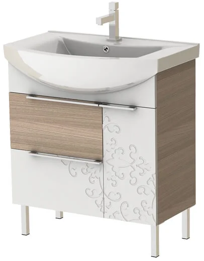 Тумба з інтегрованим керамічним умивальником має ширину 750 мм та комбіновану конструкцію з різних матеріалів. Корпус, верхні дверці та внутрішня полиця виготовлені з декорированого ДСП товщиною 18 мм кольору «пісочне дерево», а нижній ящик та декоративний напівмісяць — з матового білого МДФ товщиною 19 мм з фрезерованим узором. Модель комплектується турецьким умивальником Zenon-75 виробництва Sanovit.