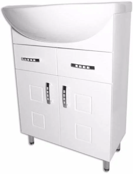 Конструкція моделі передбачає підлогове встановлення, що забезпечує стійкість та зручність під час експлуатації. Корпус виготовлений з ДСП, а фасад — з МДФ, пофарбованих у білий колір, що сприяє легкому догляду та гармонійному поєднанню з різним оздобленням ванної кімнати. Комплектація включає тумбу, умивальник і регульовані ніжки для точного вирівнювання на нерівній поверхні.
