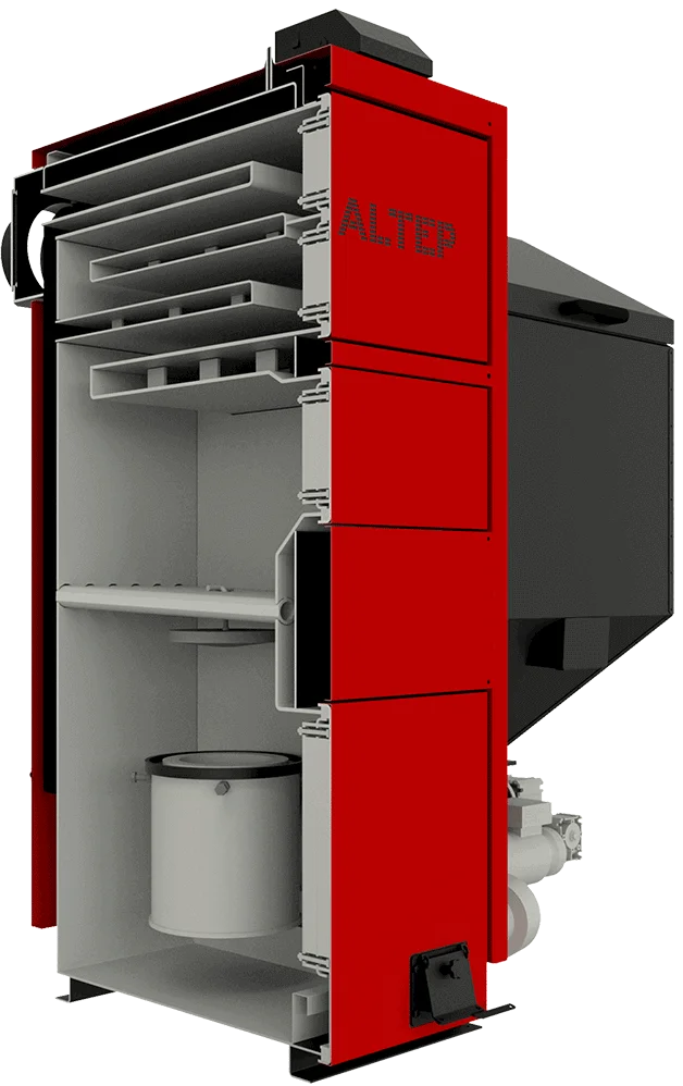 Котел оснащений об'ємним паливним бункером на 620 літрів з автоматичною подачею пелет за допомогою шнекового механізму, що забезпечує до 3-5 діб безперервної роботи. Спалювання пелет відбувається в самоочищуваній чавунній ретортній горілці, яка відрізняється довговічністю. Над топковою камерою розташований розвинений чотириходовий теплообмінник з горизонтальними водяними полицями, що максимально відбирає тепло від димових газів. Бункер також має бак аварійного охолодження для запобігання загорянню палива.