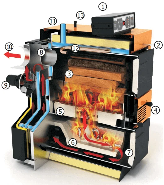 • Ефективне спалювання: Завдяки двокамерній конструкції, де відбувається окреме піролізне розкладання палива та подальше спалювання утвореного газу при високих температурах (до 1200°C), досягається майже повне вивільнення енергії з деревини.