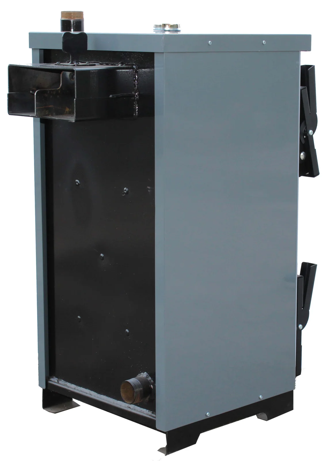 Котел оснащений сталевим теплообмінником товщиною 3 мм, що забезпечує ефективну передачу тепла та довговічність. Колосники виготовлені з цільнотягнутої труби, що підвищує їх стійкість до високих температур та зносу. Завантажувальні дверцята розташовані під кутом, що значно спрощує процес завантаження палива в камеру згоряння.