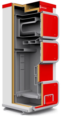 Топка котла оснащена спеціальними соплами для подачі вторинного повітря, що сприяє допалюванню газів та підвищенню ефективності згоряння палива. Над топкою розташована горизонтальна колона, яка інтенсифікує процес відбору тепла. Теплообмінник ізольований шаром екологічно чистої мінеральної вати, що мінімізує втрати тепла в навколишнє середовище. Конструкція котла передбачає можливість встановлення як механічного терморегулятора, так і автоматичного мікроконтролера з вентилятором, що дозволяє адаптувати систему управління до потреб користувача.