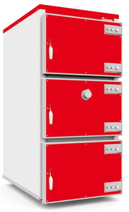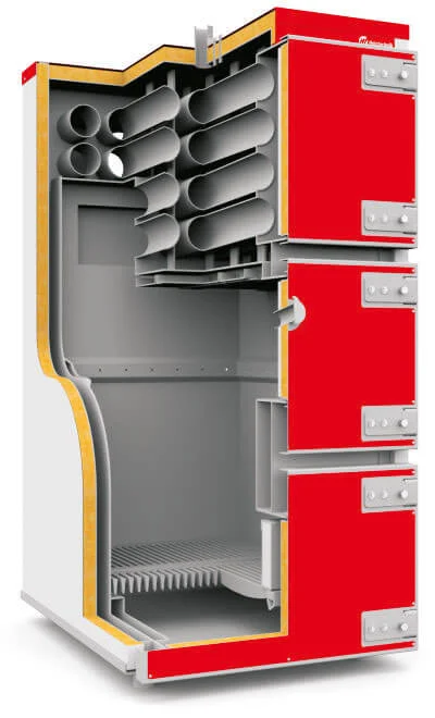 Котел має подовжену завантажувальну камеру, конструкція якої дозволяє використовувати для спалювання поліна деревини довжиною до 90 см. Процес згоряння палива відбувається на чавунних колосниках, які сприяють надходженню кисню та підтриманню горіння. Для підвищення ефективності топка укомплектована системою сопел вторинного повітря. Котел оснащений двома вентиляторами, роботою яких керує автоматика HT-tronic 350. Вентилятори незалежно один від одного подають повітря: один під колосники, другий – у верхню частину топки, забезпечуючи оптимальні умови для горіння.