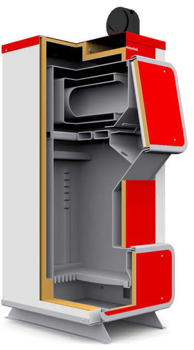 В основу котла покладено сталевий теплообмінник, зварений з атестованої сталі товщиною 5 мм, що гарантує його міцність та довговічність. Топка оснащена спеціальними соплами для подачі вторинного повітря, що сприяє допалюванню газів та підвищенню ККД до 82%. Над топкою розташована горизонтальна колона, яка забезпечує більш активний відбір тепла. Теплообмінник ізольований шаром екологічно чистої мінеральної вати для мінімізації теплових втрат.
