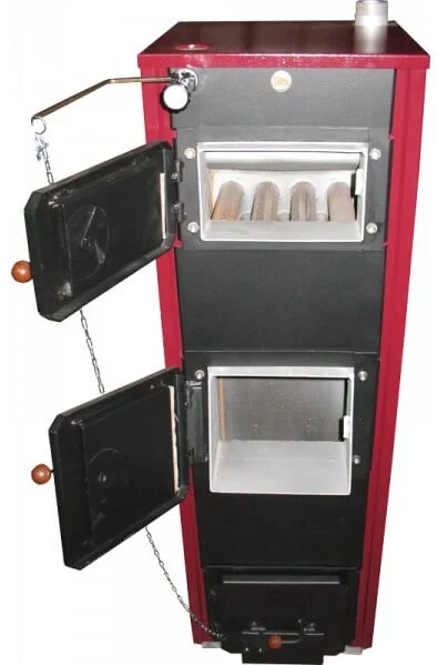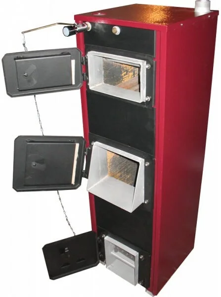 Котел являє собою зварну конструкцію прямокутної форми з листової сталі товщиною 3 мм, що складається з камери згоряння, розділеної колосниковою решіткою на топку та зольник. Навколо камери циркулює вода (водяна сорочка), що виконує функцію теплообмінника. Для мінімізації тепловтрат між корпусом та декоративною обшивкою укладена теплоізоляція. На передній панелі розташовані дверцята топки для завантаження палива та дверцята піддувала з заслінкою для регулювання подачі повітря. На задній стінці знаходяться патрубки для підключення до системи опалення, а термометр контролює температуру води на виході. Заслінка в димоході дозволяє регулювати силу тяги для економії палива. Коефіцієнт корисної дії становить 74%.