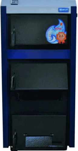 Основою конструкції є сталевий теплообмінник прямокутної форми, що включає топку та конвективний двоходовий газохід. Між зовнішніми стінками теплообмінника, топкою та газоходом утворена водяна сорочка, яка забезпечує ефективний відбір тепла. Топка котла шахтно-шарового типу, а для підвищення ефективності роботи в режимах малої потужності та тяги передбачені спеціальні канали. Механічне регулювання кількості вторинного повітря, що подається в топку, здійснюється за допомогою повітряної заслінки на нижніх дверцятах, що дозволяє оптимізувати процес горіння. Котел працює на різних видах твердого палива, таких як антрацит, дрова, кам'яне вугілля та кокс, забезпечуючи коефіцієнт корисної дії до 75%. Теплообмінник виготовлений зі сталі товщиною 4 мм, що гарантує його надійність.