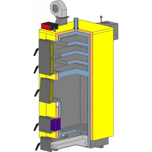 Котел виготовлений зі спеціальної котельної сталі товщиною 5 мм і представляє собою складну зварну конструкцію. Вся внутрішня частина котла є великим теплообмінником, який зовні обшитий теплоізоляційним матеріалом та захисним металевим кожухом. У верхній частині котла розташовані додаткові горизонтальні полки-теплообмінники, що сприяють максимальному відбору тепла. Нагнітаючий вентилятор, розташований у нижній частині, подає повітря через спеціальні форсунки в топочну камеру, забезпечуючи верхній принцип горіння палива.