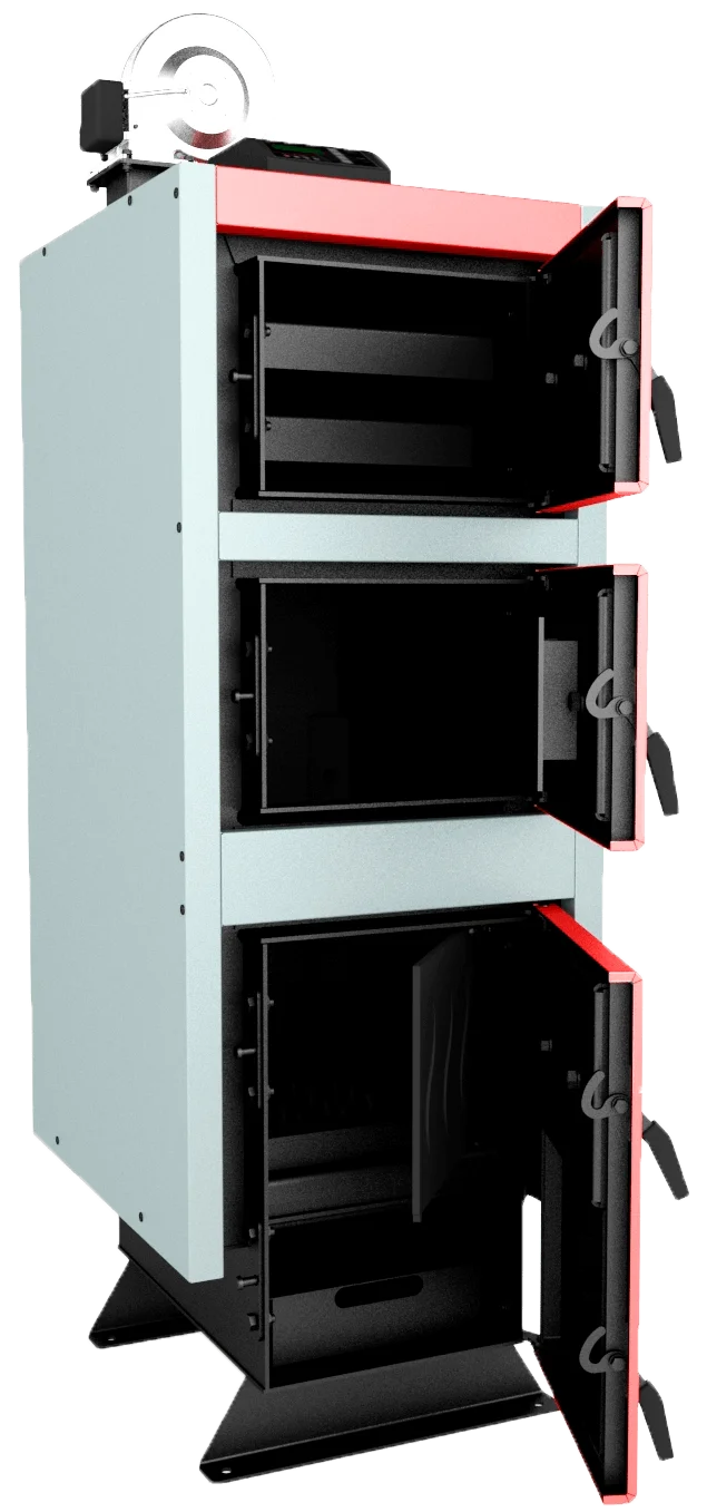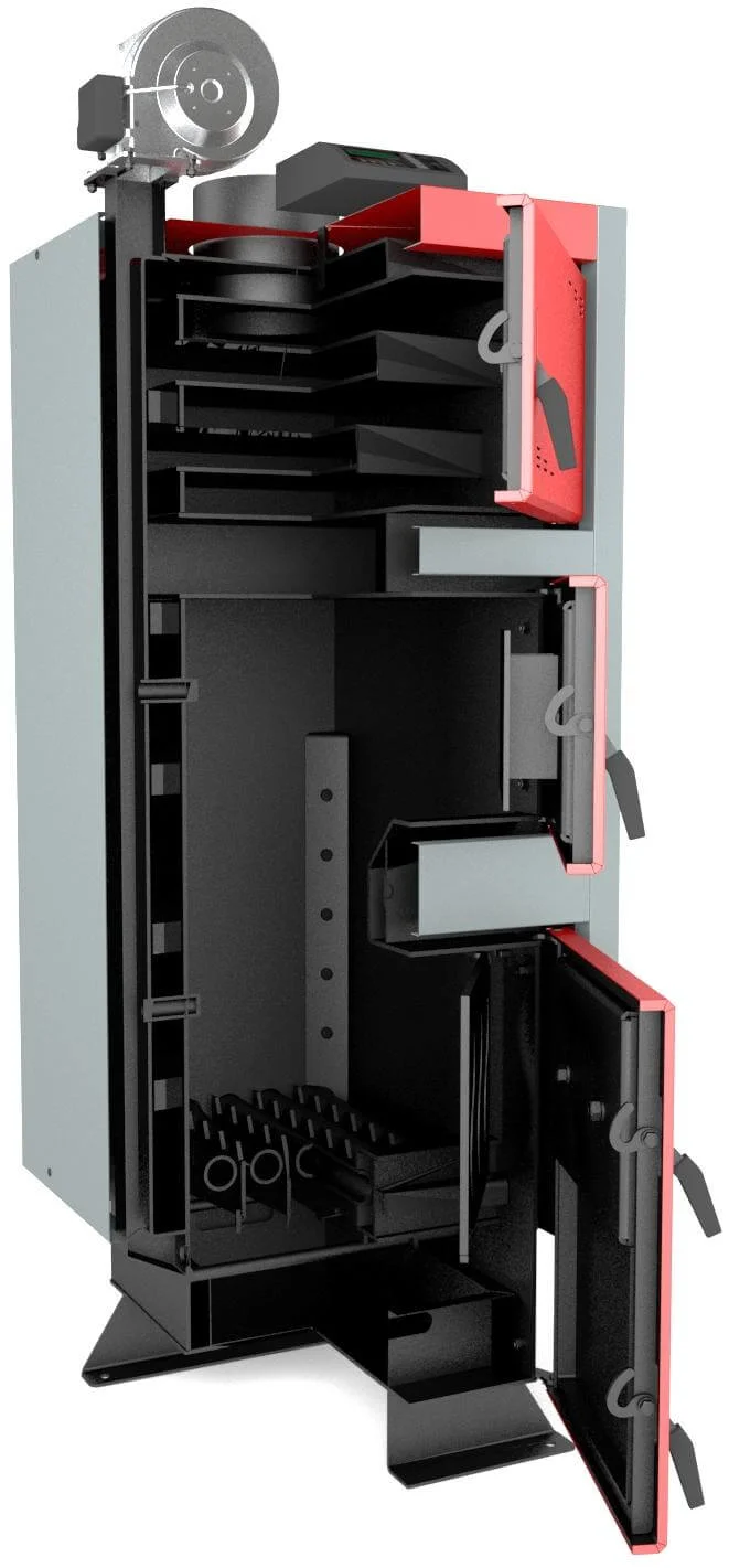 - Оптимізоване горіння: Завдяки об'ємній завантажувальній камері та системі подачі вторинного повітря, котел досягає високого ККД не менше 85%.