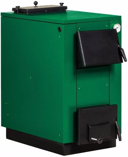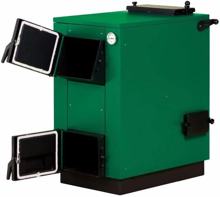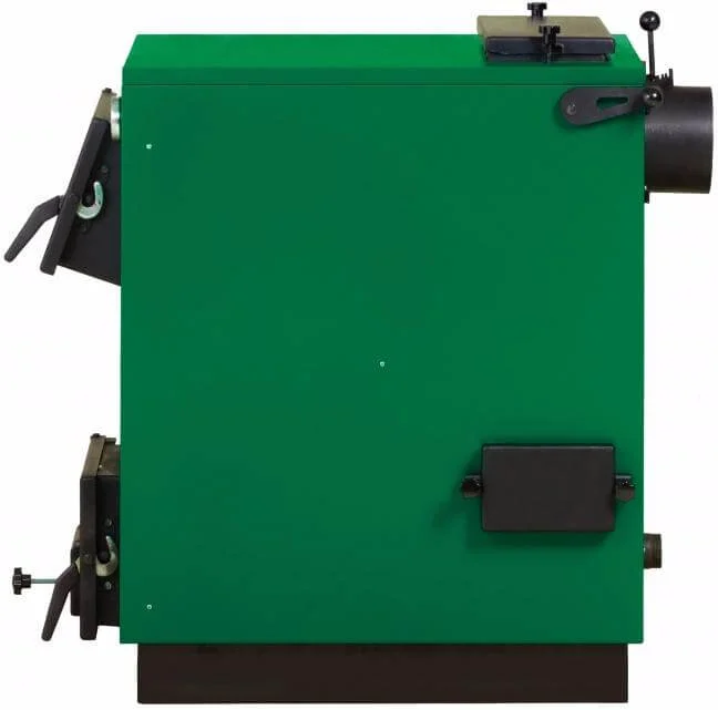 Конструкція котла передбачає дві дверцята: верхня, розташована під нахилом, забезпечує зручне завантаження палива, а нижня, пряма, призначена для легкого очищення внутрішньої частини котла від золи. Вертикальний теплообмінник, розміщений у задній частині котла, має спеціальні ревізійні люки для зручного чищення конвекційних каналів. Круглий димохід обладнаний шиберною заслінкою для точного регулювання тяги.