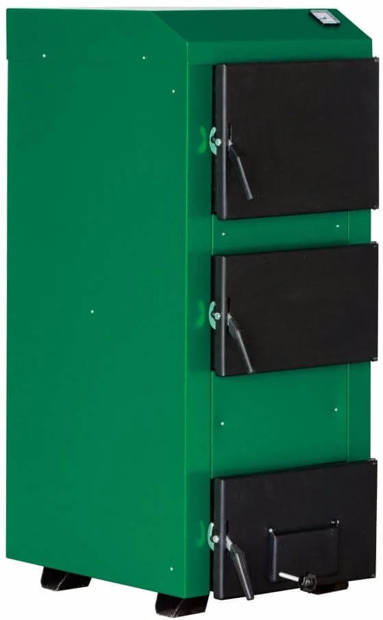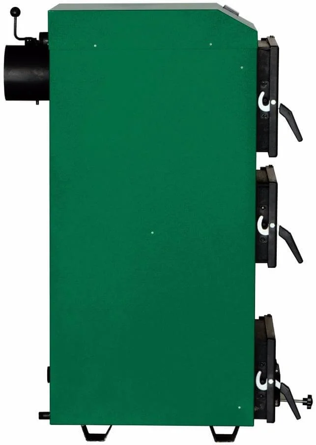 Процес горіння відбувається на чавунних колосниках, які сприяють ефективному спалюванню палива. Для максимального охолодження вихлопних газів теплообмінник має спеціальні перегородки, по яких циркулює теплоносій, підвищуючи ККД до 80%. Унікальною особливістю є можливість експлуатації котла як електрокотла шляхом встановлення електричного ТЕНа у спеціальний отвір. Це рішення є практичним для підтримки температури в системі опалення під час тривалої відсутності. Димохідний вихід круглого перерізу розташований ззаду та обладнаний шиберною заслінкою для регулювання тяги. Дверцята котла мають ущільнювальний шнур, що запобігає виходу диму в приміщення, а теплообмінник утеплений для збереження тепла.